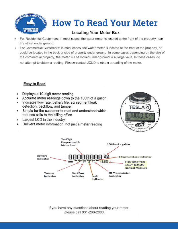 For more information on how to read your water meter or how to detect a possible leak, take a look at our downloadable guide. Feel free to print this guide to have on hand as you look at your meter. As always, if you have any questions, please contact our office at (931)268-2880.